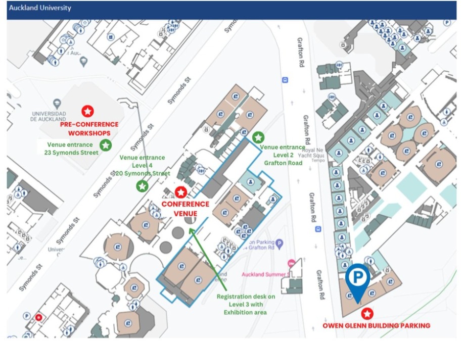 Located in central Auckland, the Faculty of Engineering is the location for the 2025 conference. Entry to the building is off Symonds Street (Level 4), make your way down the stairs to level 3, or, off Grafton Road (level 2) make your way up to level 3. Grafton Road access is near the parking building at the Owen Glenn Building.