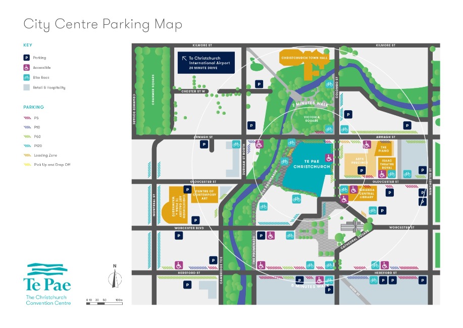 Parking options, including e-vehicle charging stations and bicycle parking spaces are available in the area surrounding Te Pae Christchurch. Please note that there is no parking available on site at Te Pae.